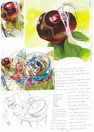 研究這個藝術家,在你的sketchbook里做好筆記,包括對方的構圖、寓意、媒介等等。在空白處可以用插畫的形式做一些筆記,來解釋討論對方使用的技術,媒介,材料,構圖(每個元素之間的關系),線條、形狀、顏色、色調、紋理、空間。討論這些元素從視覺元素出發,如何吸引注意力、強調、平衡、聯系或者直接表達觀點。幾下這些想法、情緒,以及這些和你的作品有什么關系。這些都是你仔細做過調研的證據,其中也包括了你自己的想法,所以也就是你發展的過程哦。