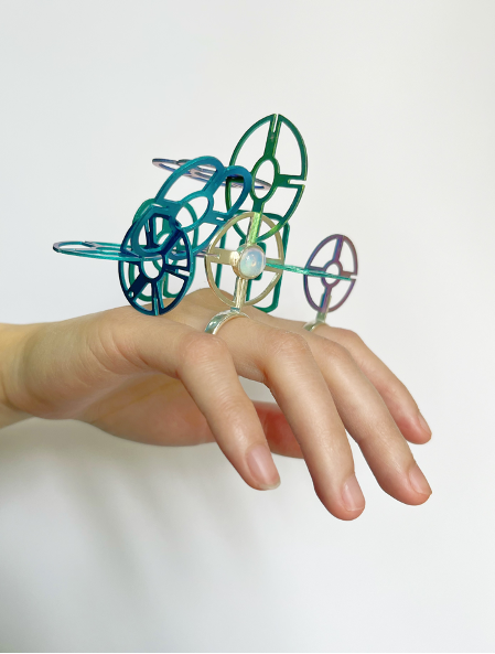 組裝一個造型通常需要較多的模塊才能獲得立體豐富的效果,所以設計師選擇了鈦金屬,這種同等體積下質量較輕的金屬,并用陽極氧化工藝上色,增強模塊化首飾趣味性的表達。成品包含戒指、耳環、項圈配件與四種形態的金屬雪花片,供佩戴者把玩、組合。