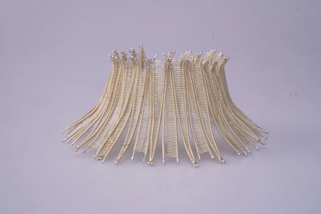 通過探索蠶的自然建造結構在首飾創作中產生的藝術性,汲取其編織、造型的方式與特點,嘗試將蠶的三維空間建造手法運用到首飾設計中。作品利用絲線的穿插來引導視覺空間,同時隨著蠶絲表面折射與反射光線的變化吸引觀者從多角度觀看作品。