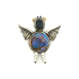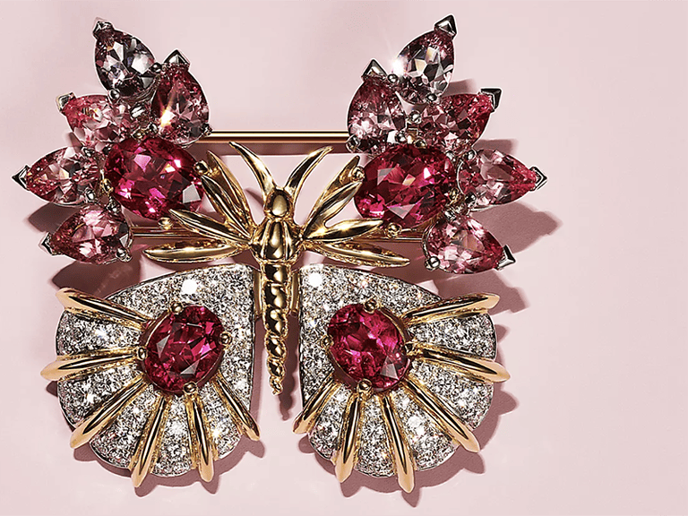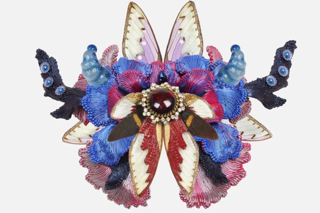 Materials: 18k yellow gold, sterling silver, porcelain, crystal, sapphire, butterfly wing
