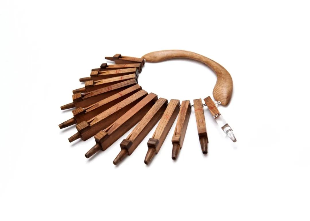 neckpiece, wood (organ pipes), rock crystal, silver