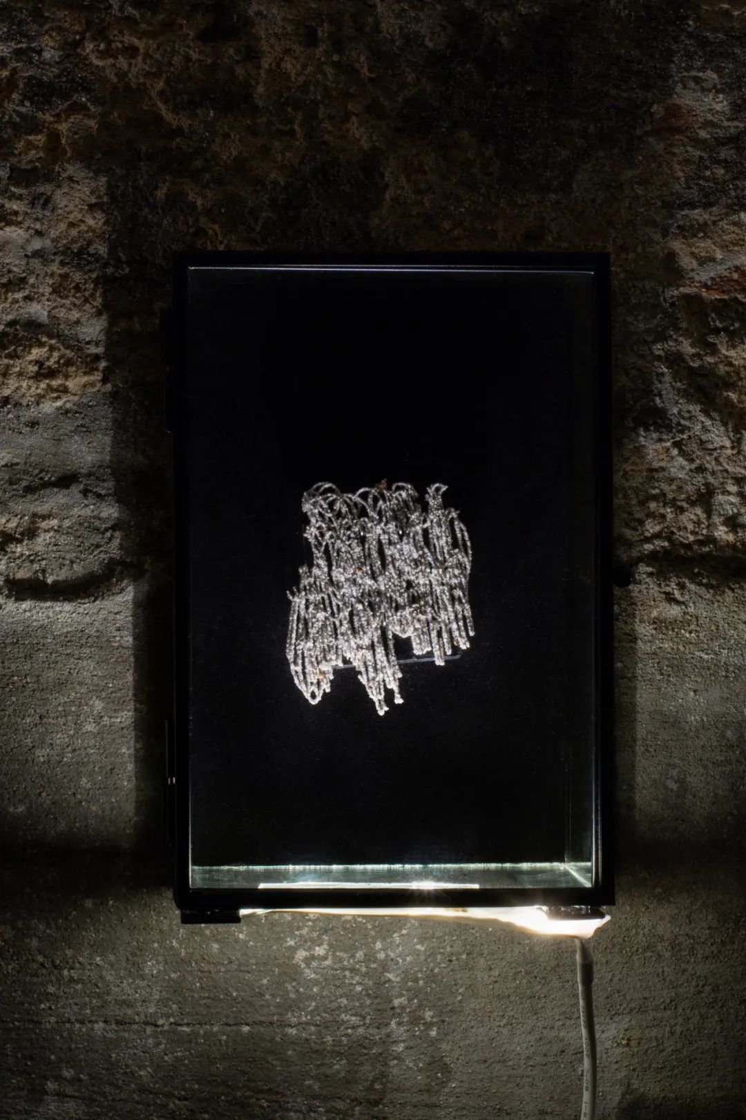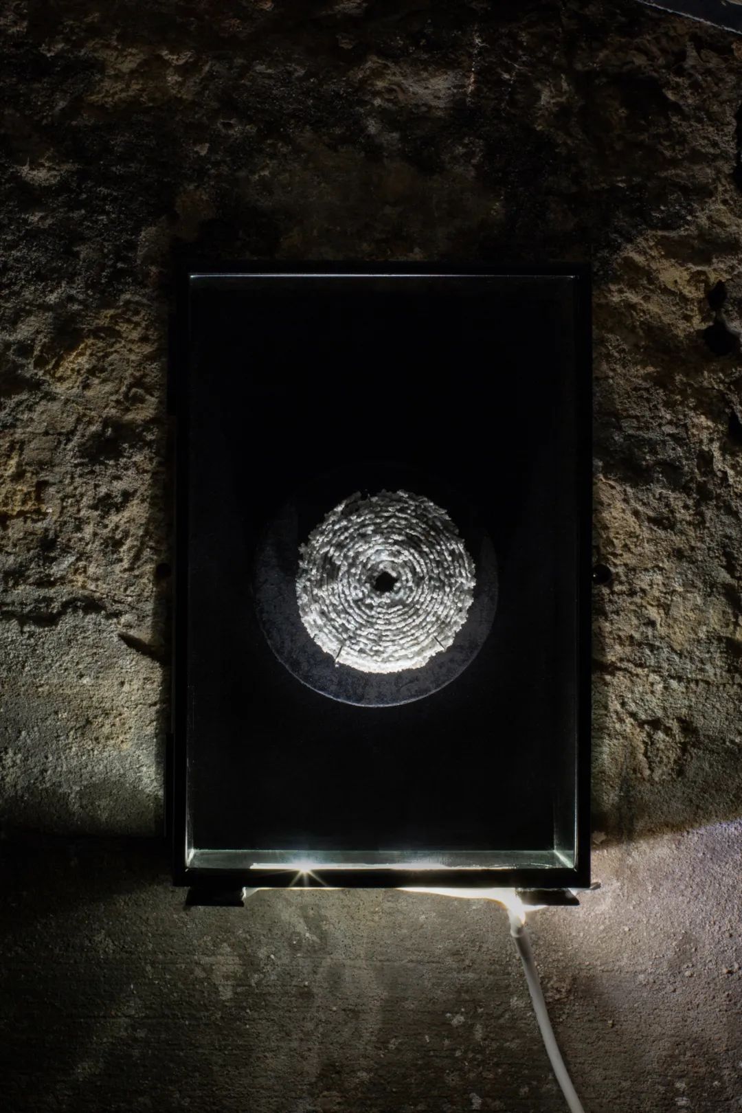 A:展覽布置花費了很多心思,因為我選的是地窖,給我提供了很大的展覽空間,但那只有一盞燈,十分昏暗。于是我決定干脆就全都暗下來,只照亮作品。一部分“考古碎片”陳列在玻璃桌里,也特意為一部分“保存完好的文物”制作了燈光展示盒,懸掛在墻上。引導觀眾的視線,也給整個空間營造了比較神秘的氛圍。