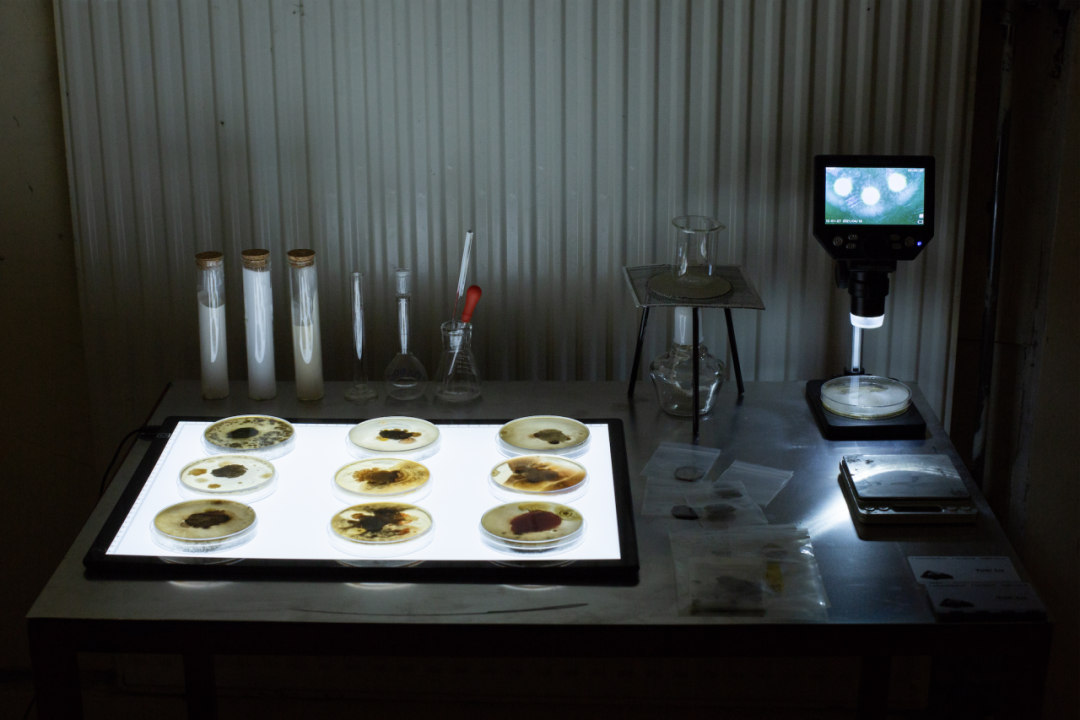 我在安特衛普的一個地堡里虛構建造了一間城市考古實驗室(建立于2430)邀請觀眾進入這個沉浸式空間來探索未來的考古發現和檔案。在這里展示的物品反映了21世紀城市生活的碎片。比如:建筑工地的磚塊,超級市場的收據單,房屋住宅的柵欄以及街道路面的口香糖,這些可識別的物體隨著時間的推移轉變為具有植物,動物或是礦物特征的生物形態。