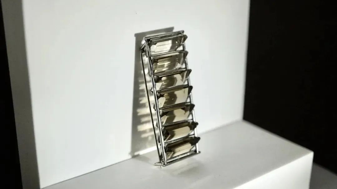 在她的作品集中,洛伊絲融入了類似腳手架、梁和工業(yè)結(jié)構(gòu)的元素,以不同的角度鑲嵌石頭。通過利用煙熏石的獨特特性,她實現(xiàn)了類似黎明的漸變效果。長方形石頭的幾何切割增強了它們的光澤,而不銹鋼結(jié)構(gòu)則為佩戴者提供支撐。