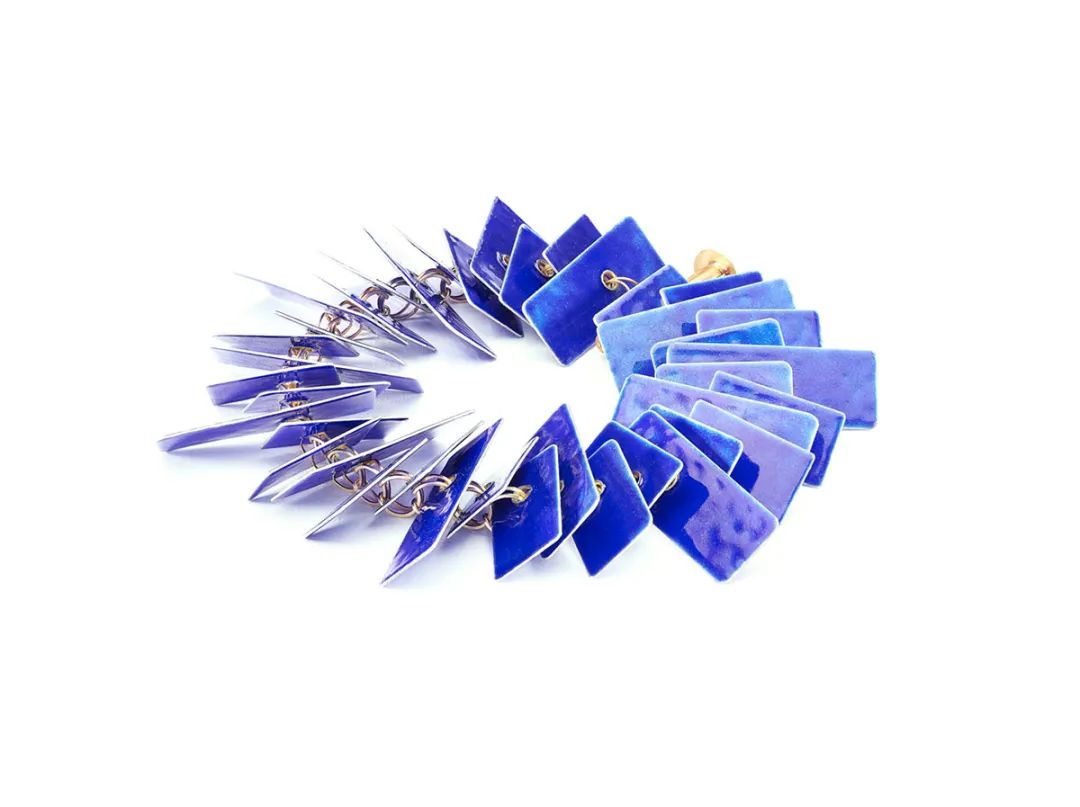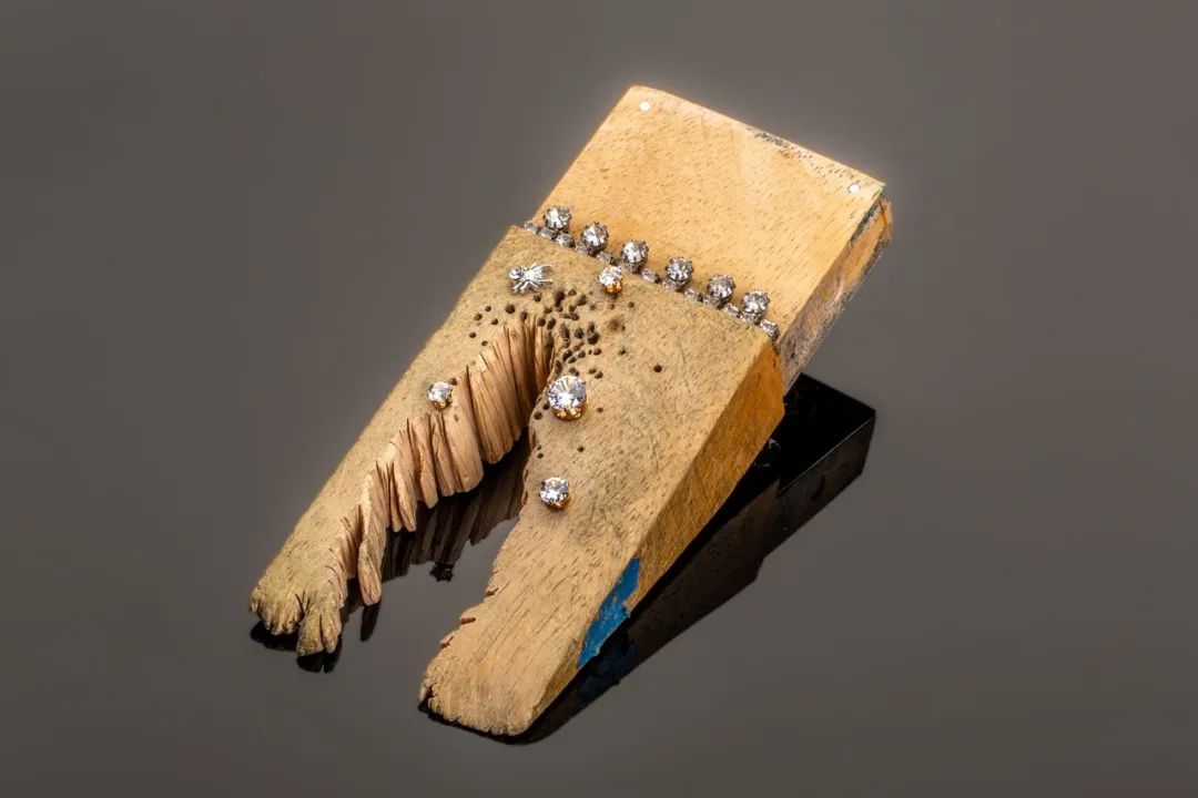 這個展覽完全取材于 RAM 不斷增長的收藏,在慶祝當代珠寶的同時強調從新的角度(有時是字面意思)考慮它。例如,有些胸針的展示方式會將注意力集中在背面而不是正面。雖然佩戴一件衣服時背面可能是看不見的,但藝術家可能仍然會利用它是佩戴者與之互動的一面這一事實——延續正面的元素,添加銘文,或者至少,深思熟慮地融入它進入整體構圖。
