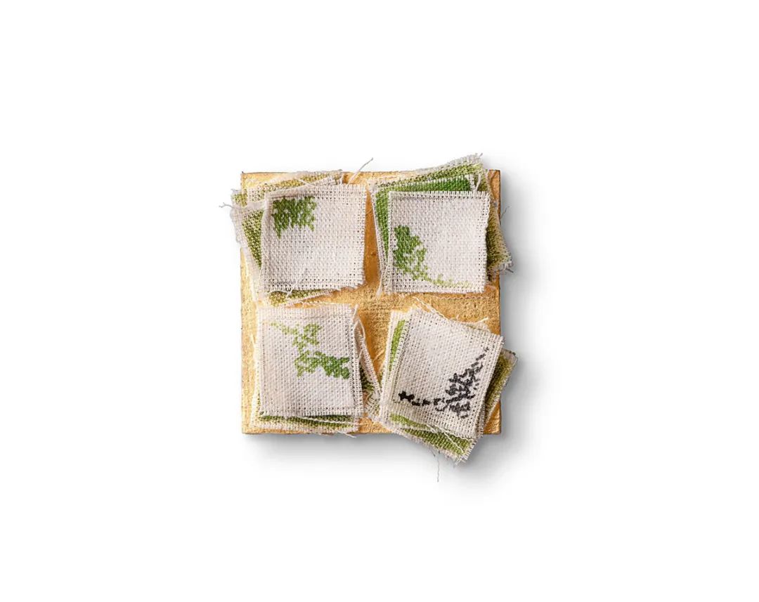 在本次展覽中,Brand采用傳統的燙金工藝,在廢棄玻璃制品上貼上文字,顛覆了垃圾與寶藏的概念。她對對話和聯系時刻的興趣通過在以前的玻璃頂桌子上的鍍金公告找到了新的機會。她的作品將精選的材料與簡潔的短語相結合,在喜劇和悲劇之間搖擺不定。