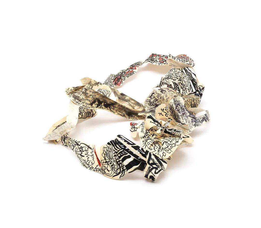 “BABS 很高興從 2023 年 5 月 24 日起舉辦 Daniele Papuli, CARTH? – ? – PORTER 的個展,藝術家在展覽中將雕塑和設計物品與專門為此場合創作的珠寶系列相結合。應畫廊的邀請,Papuli 為 BABS 藝術畫廊創作了這些可穿戴藝術品,成功地將輕盈與場景視覺沖擊力結合起來。事實上,用于制作它們的色彩鮮艷的紙張,通過手工疊加和切割,吸引了觀察者的眼球,同時對佩戴者來說非常輕便。”