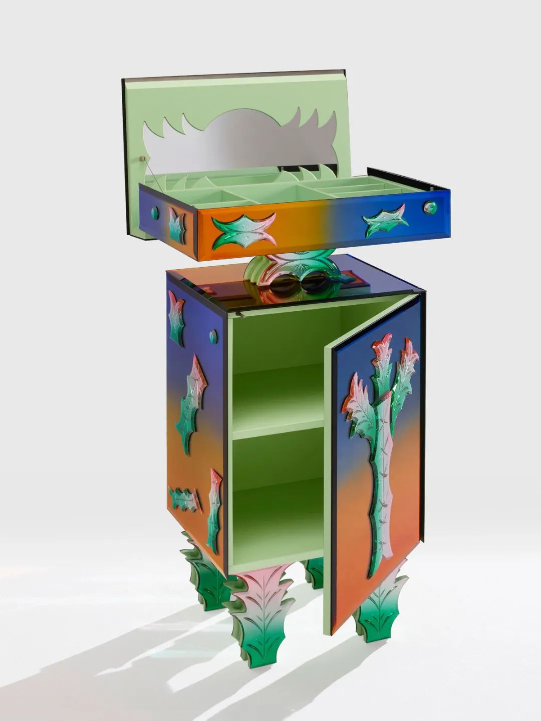 Silver, mirror, resin, amethyst, garnet, onyx and synthetic ruby