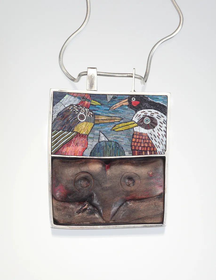 Deganit Stern Schocken 將粗糙、未拋光的部件(可能在街上發現并被視為垃圾的物體)與優雅的銀色或濃色部件結合在一起,與生銹的鋼制雙胞胎相呼應,并呈現出它的顏色和細節。具有平衡性、敏感性、政治邊緣和幽默感——當代珠寶的巔峰之作!