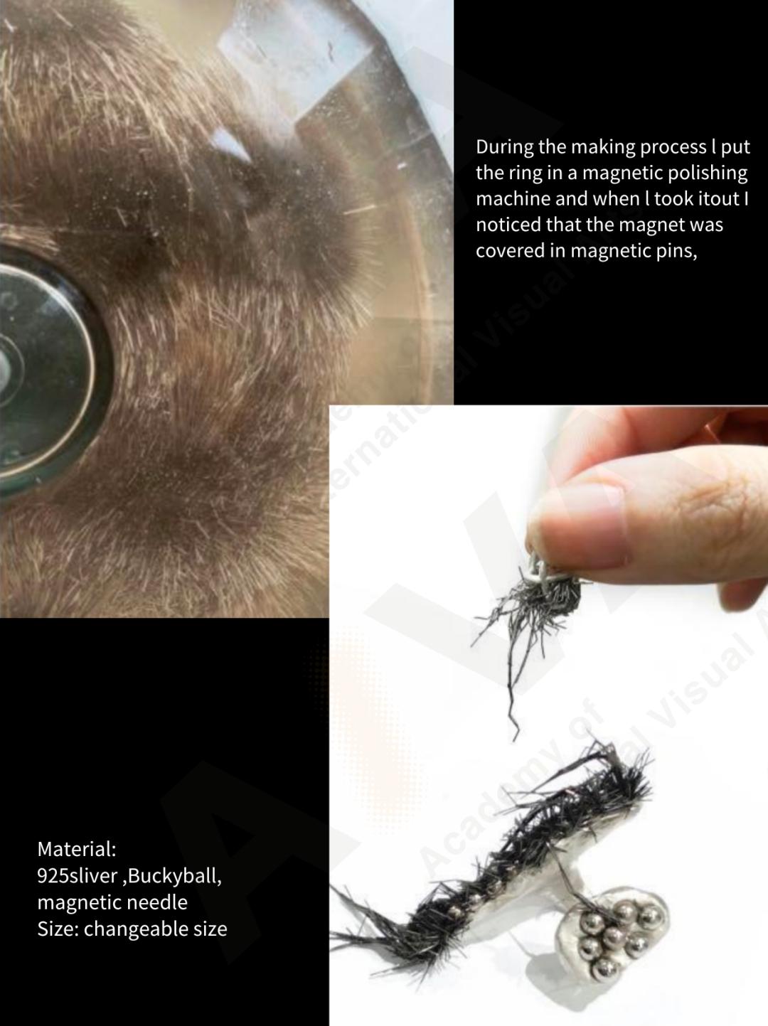 “在制作過程中,我把戒指放進了磁性拋光機,當我把它取出來時,我注意到了它的磁性。這些磁針按照磁力吸引的方向有序排列,具有很強的磁性。”