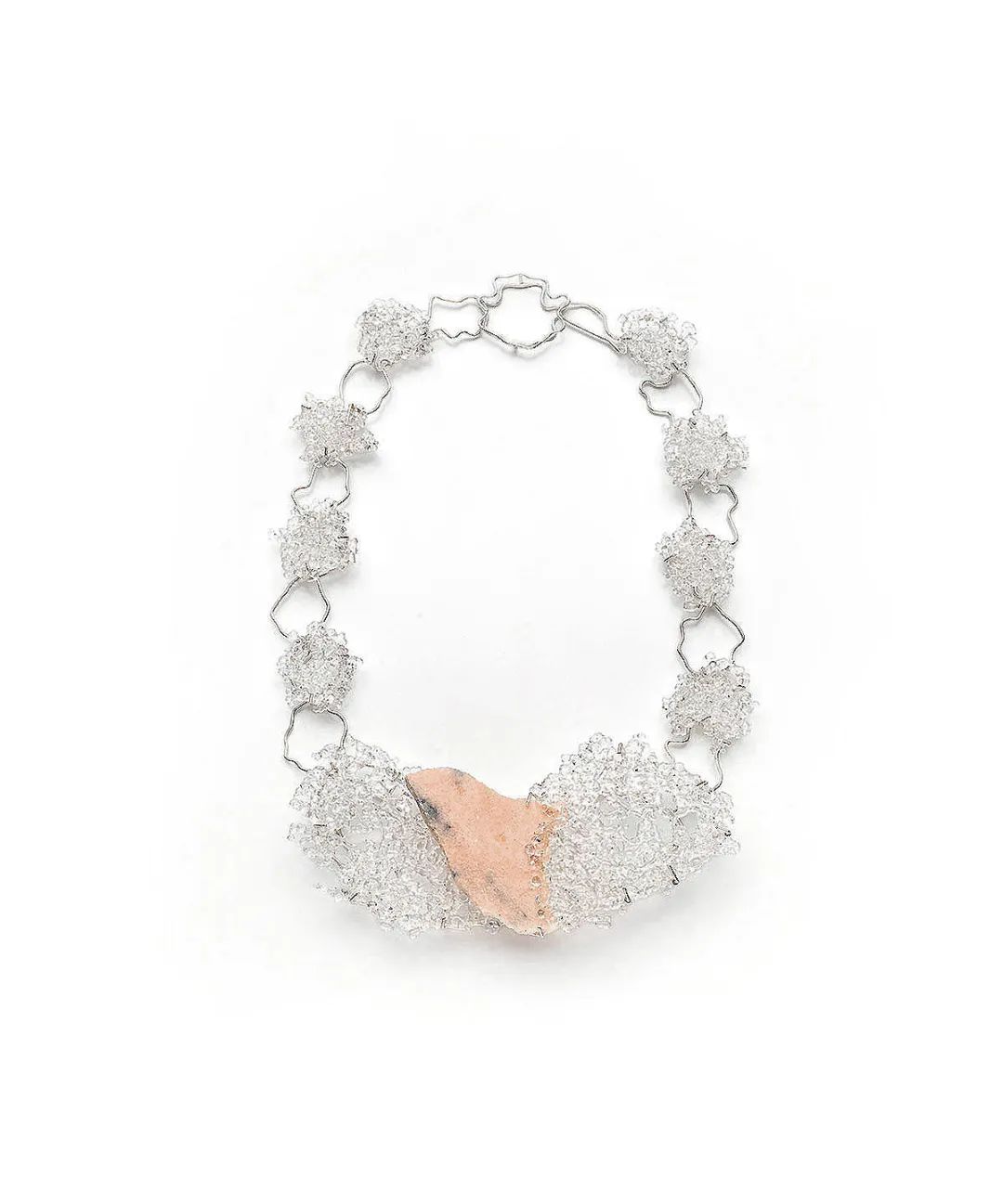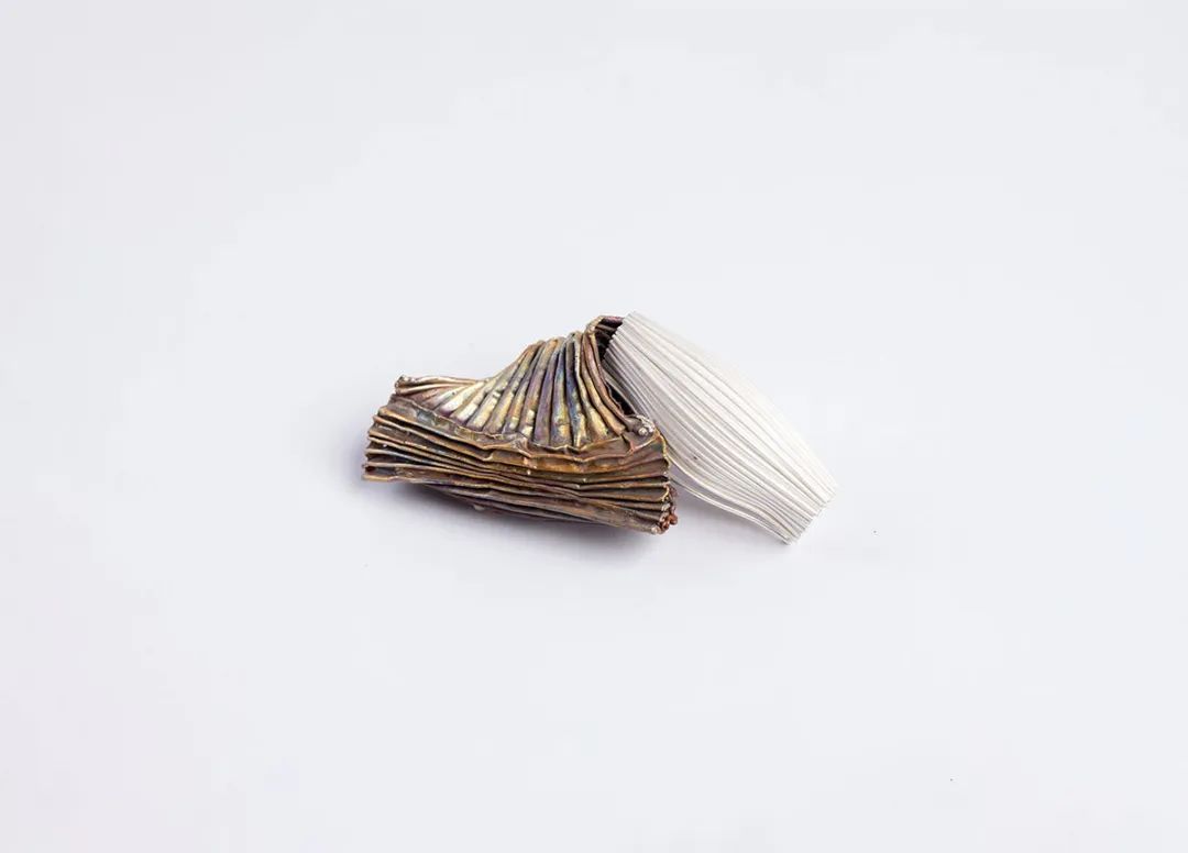 對于Hee-ang來說,蘑菇絕不僅僅是餐桌上的食物。在一次散步中,她偶然發現一株野生蘑菇,被它獨有的美所觸動,這使她有機會去深入研究這一特別的生物。最初,她嘗試用作品去還原一株完整蘑菇的構造,以展示其本身的復雜細節。然而隨著時間的推移,她發現從蘑菇的萌芽到腐爛的整個生長過程,都給她帶來了極大的啟發。Cluster系列以蘑菇“鰓”為主要設計元素,想象了蘑菇群是由廣泛分布的地下菌絲體形成的。另一方面,Inside Out系列設想將蘑菇帽翻過來,露出“鰓”,在內部和外部紋理之間形成節奏對比。Bloom and Wither捕捉了蘑菇生命周期的各個階段,而Slowly則描繪了蘑菇逐漸展開的過程。