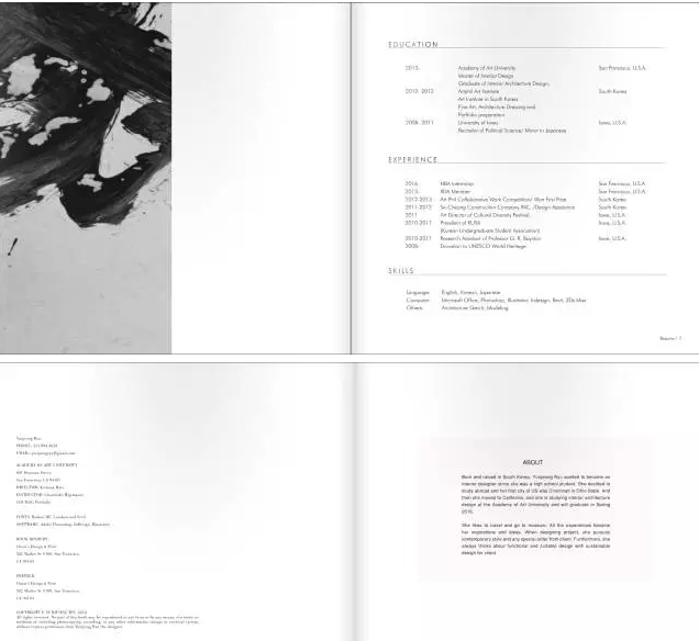 封面過后就是扉頁,很多學(xué)生選擇在這里列出自己的作品集項(xiàng)目或是簡歷都是可以的,可以是設(shè)計(jì)師對(duì)自己進(jìn)行了一個(gè)介紹,或是羅列一下自己的教育經(jīng)歷和工作經(jīng)驗(yàn)等。