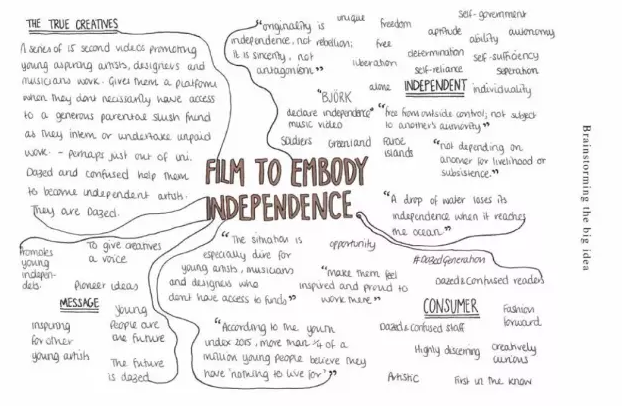 此外Research中還應(yīng)該加入brainstorming、mind-map等思考環(huán)節(jié)。那么什么是mind-map呢?就是圍繞著中心論點(diǎn)展開蜘蛛網(wǎng)般的發(fā)散觀點(diǎn),所有的小觀點(diǎn)和主論點(diǎn)是有一定聯(lián)系的。