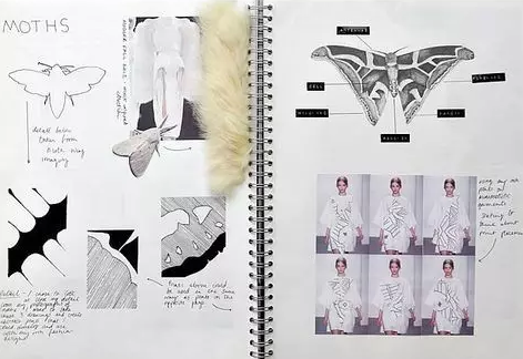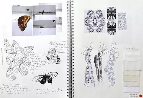 下面這個(gè)案例相對(duì)上圖,Research從服裝結(jié)構(gòu)上加上靈感點(diǎn)(蝴蝶)。這個(gè)案例中可以看到學(xué)生運(yùn)用文字和sketch結(jié)合的方式,來說明自己的研究過程。