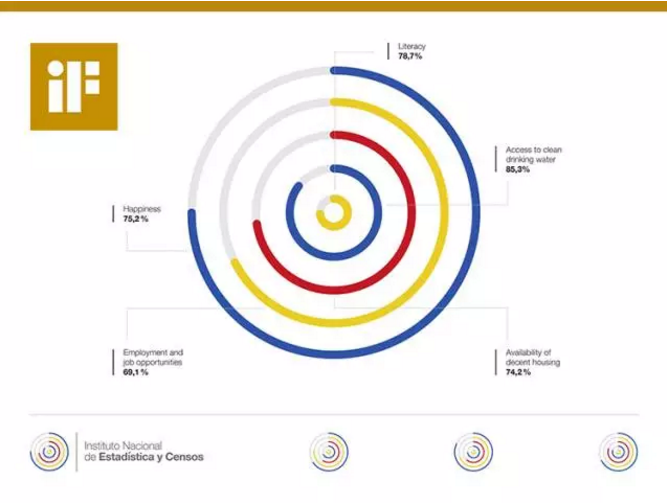 INEC,做為厄瓜多爾官方政府的數據統計機構,不僅僅是收集數據,而是利用收集來的數據,以logo的形式來反應整個國家的即時狀況。五個圓弧形分別以厄瓜多國旗主色填入,各自代表一項變數,按照其演進而變化。根據 INCE 的資料,此標志會持續自動更新,變數改變時,標志也隨之幻化。資訊可以不同形態展示,如文字、數值及圖表,轉換供各種媒體應用