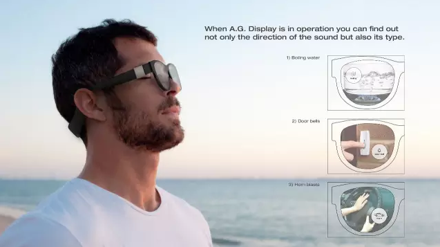 Assistant Glass Set的概念生動地轉譯和視覺化了聽障人士所察覺到的世界。這是一個嚴格而精準的解決方案,展示出聽障人士可能錯過的感官刺激。這個項目代表著一個對于殘障人士的感官和安全方面非常重要的改善,感官科技整合入了常規眼鏡的形式中,讓這個裝備在他人眼中難以察覺。