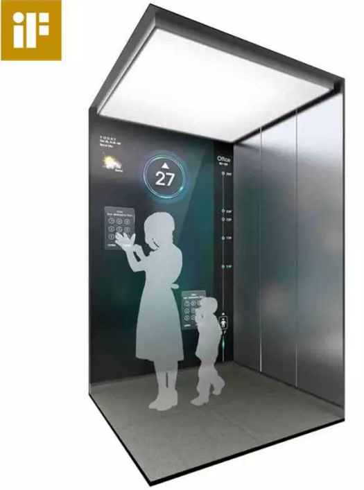 這是一部對身高friendly的電梯,相比我們常見的電梯,按鈕的設計位置固定在成人的標準高度,對于身高較高或較矮的人使用起來總不太順手。這部電梯在側面設有一個大型觸屏,乘梯者只需觸碰墻上的任意位置,都會顯示一個目的地的輸入窗口。同時,它還提供多點觸控,多個乘梯者都能同時選擇自己的目的地。屏幕右方的信息欄還會顯示各種使用信息,包括所在樓層、時間、天氣情況等。