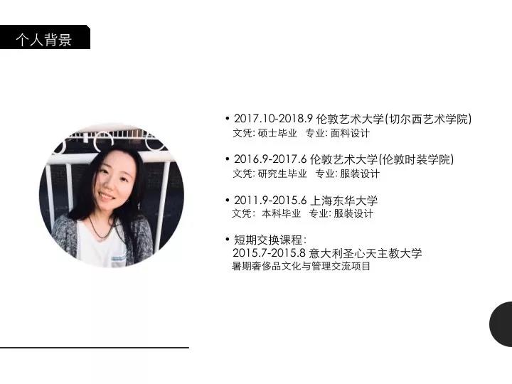 我本科畢業于上海東華大學服裝設計專業,之后分別在倫敦藝術大學下設的倫敦時裝學院和切爾西藝術學院修讀了服裝設計和面料設計的研究生課程,并且在意大利交換過一段時間奢侈品管理方向的短期課程。