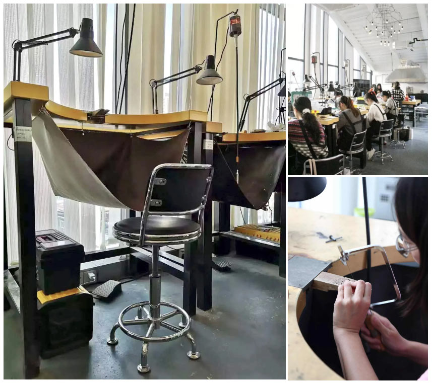 按需劃分的話,一個完備的金工首飾工作室應該具有如下功能區:設計區、個體工作區、初級加工區、鍛敲區、焊接區、清洗區、琺瑯區、寶石琢形區、鑄造區、化學區、拋光區、儲藏區、設備區、展示區等等