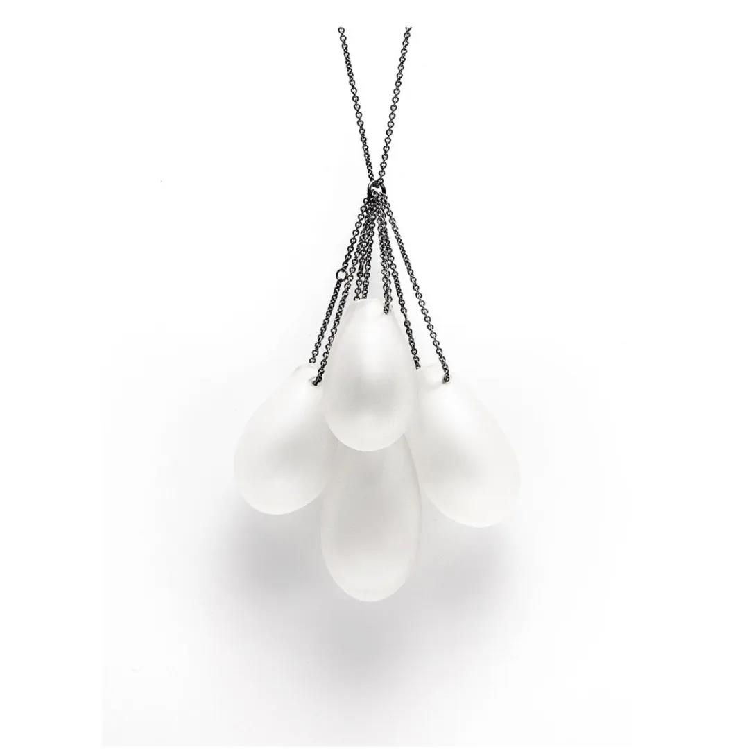 吊墜是由一根銀鏈與四個手工吹制的玻璃元素連接而成。Evert Nijland將空氣吹入玻璃管中,創造出有機形態。噴砂玻璃元件形成了假想的容器,代指我們目前所處的封鎖的狀況,在這種情況下,我們盡可能多地呆在家里,而外出變得不再隨心所欲。