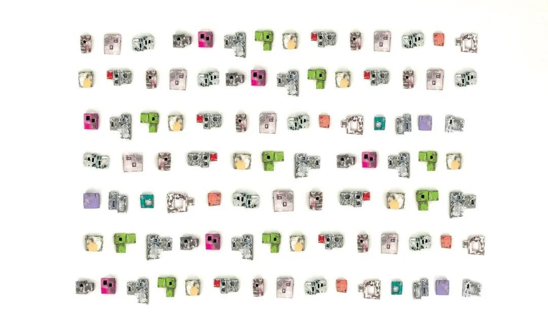 cement, sterling silver, resin, steel, pigment, thread, duct tape, powder coat, wood, and nickel silver