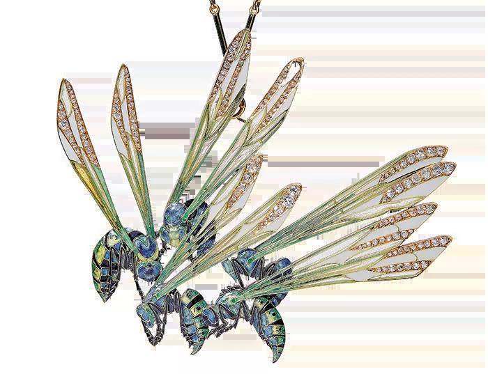 鏤空琺瑯是當時特別流行的表現方法,蜻蜓的翅膀經常處理成薄紗一樣的效果,然后在每一個小孔中填充透明并且帶有微妙色彩的琺瑯材料。牙角之類的有機材料被用來制作梳子,有時使用月光石之類的寶石作為點來顯示雨滴的效果。
