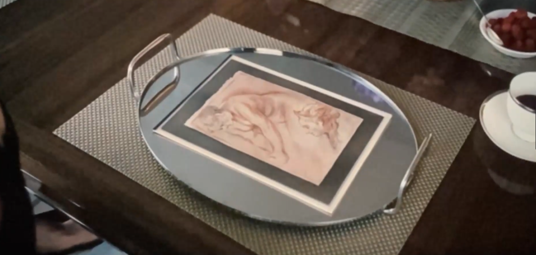 反派一號Sator通過盛在早餐盤中的戈雅偽作,不動聲色地揭露了妻子對他的“背叛”。給到這張A4大小的畫作的鏡頭一閃而過,這一瞬,諾蘭不僅給觀眾留下了懸念,也通過這個重要物件留下了解謎的線索。
