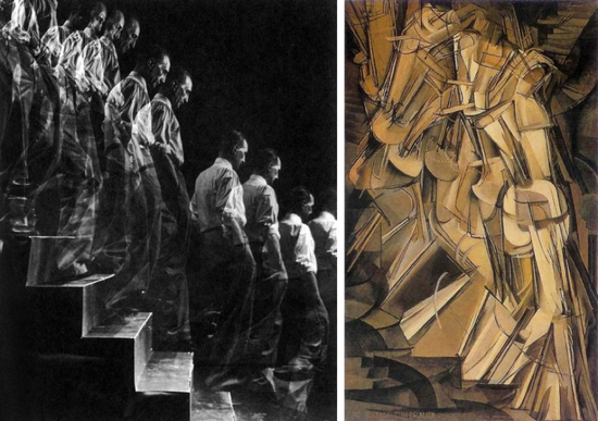 杜尚的《走下樓梯的裸女》呈現了主體“裸女”步下樓梯每一瞬時間里在空間中留下的“存在”印記,畫面有延時攝影的逐幀感 圖源:網絡