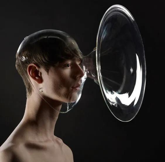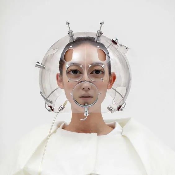 韓國藝術家Hyungkoo Lee創(chuàng)作的這個面罩在眼部和嘴部設置了放大鏡,使得所有帶上的人,眼睛嘴巴瞬間放大,且到了極度夸張的地步像是外星人一樣。試圖表達的概念顯而易見,即是對當下整容當?shù)?,女性趨之若鶩般的想對自己的外形進行改造這種現(xiàn)狀的質疑和反思?;蛟S未來的某一天,人類的外形就會逐步進化為戴上這個頭飾后的樣子。
