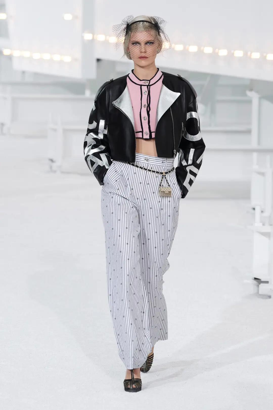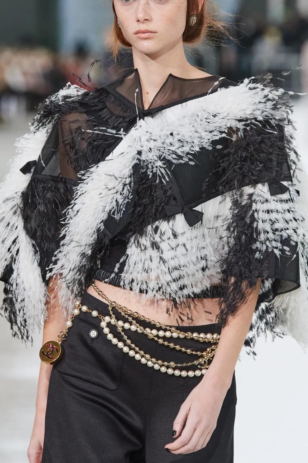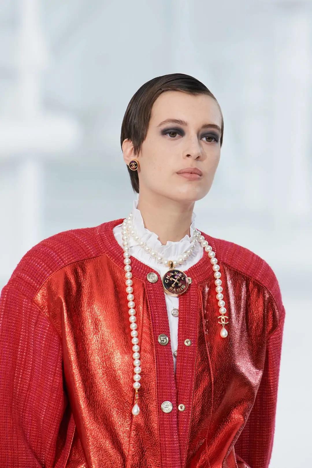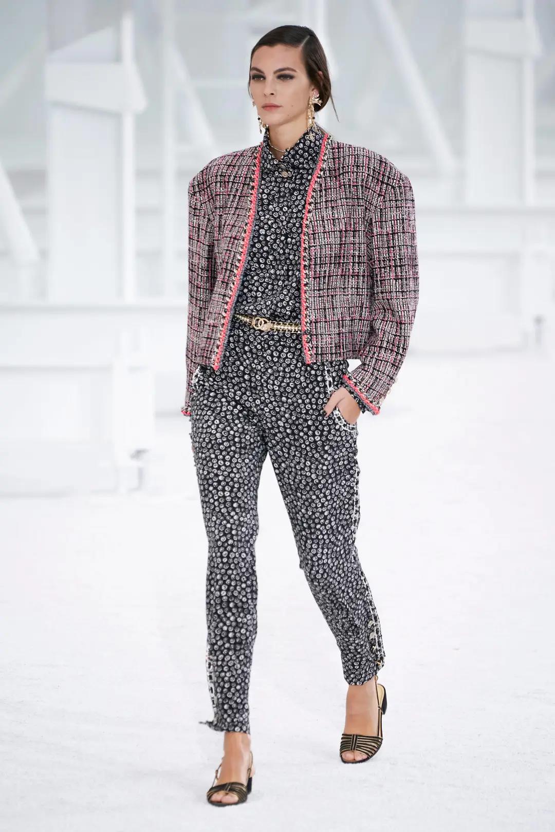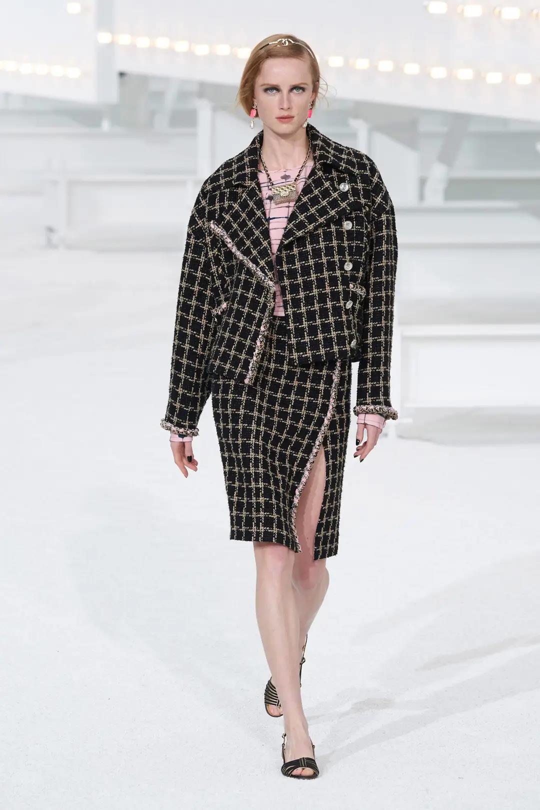 本季Virginie Viard以Chanel女士的靈感繆斯為靈感,致敬電影藝術。黑與白作為主要的基調貫穿整季,再現了復古黑白電影中經典的Chanel乳白與黑色斜紋軟呢套裝。在延續致敬經典的同時,該季度也更加注重實用性和年輕化。霓虹Chanel字母的圖案面料,明亮的春季配色為新一季的春夏注入活力。