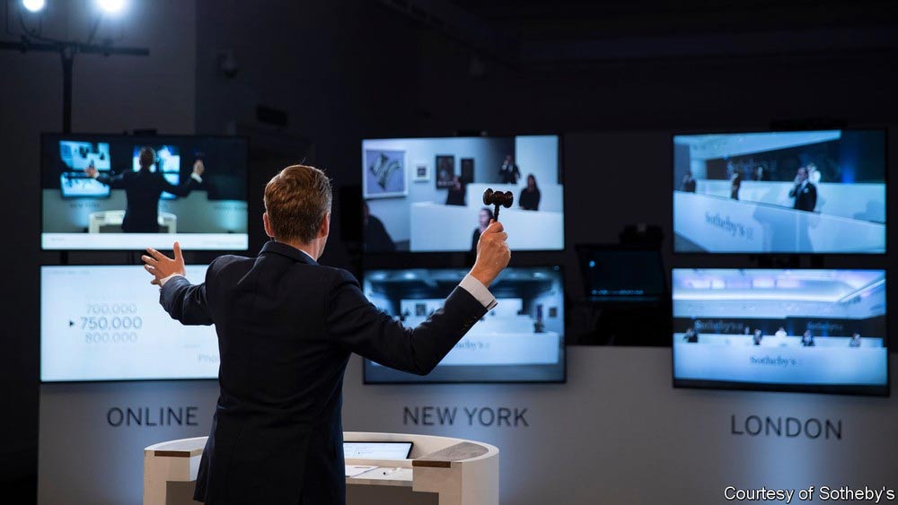 而今年的新冠疫情也促使全球藝術(shù)界真正開(kāi)啟了“直播賣貨(拍賣)元年”。美東夏令時(shí)6月29日晚,蘇富比印象派、現(xiàn)代藝術(shù)及當(dāng)代藝術(shù)夜間拍賣首次以網(wǎng)上直播的形式,橫跨時(shí)區(qū)聯(lián)動(dòng)紐約、倫敦、香港三地同步舉槌進(jìn)行。