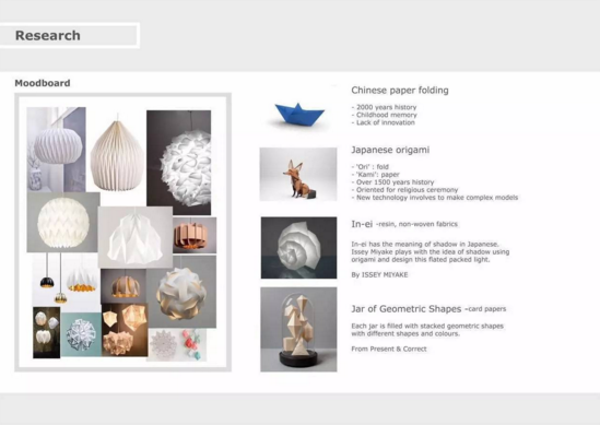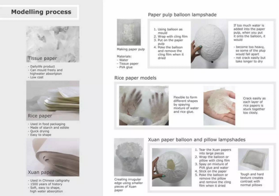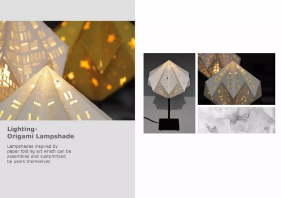 A:這個燈的項目分兩個部分,第一個部分是關與折紙,而另一個是關與不同種類紙的塑造性。我嘗試用紙折了不同形狀和reform不一樣的紙做成了燈罩。那個折紙燈的靈感來平時的包裝泡泡?(并不知道那東西叫什麼,反正我就喜歡把它們一個個捏爆),然后燈罩上的圖案是可以摳掉的。還記得在上海的時候住在酒店,我房間都是折紙和還會帶一大袋宜家的燈回去然后酒店前臺和阿姨都認識我,hin尷尬。