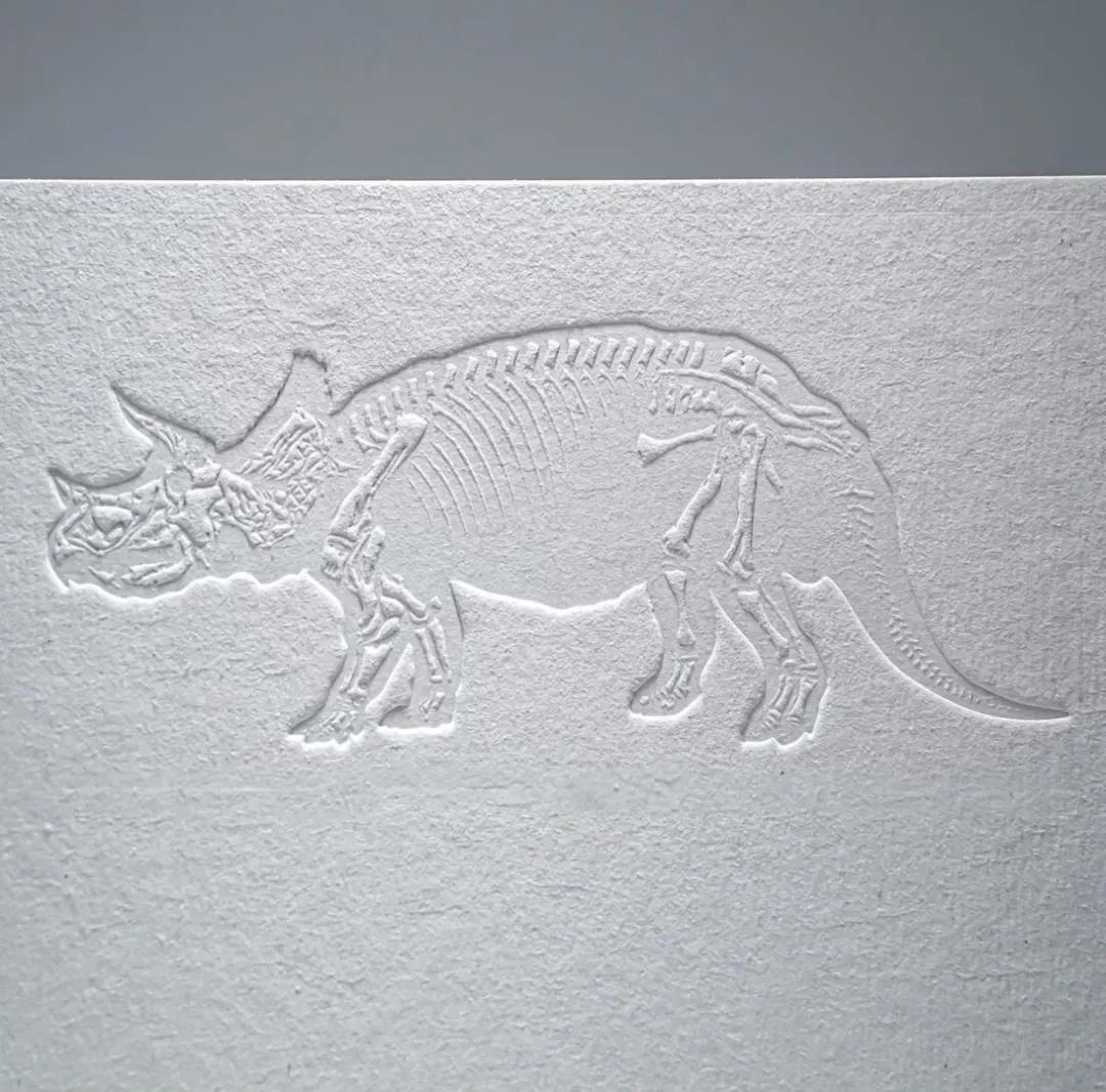 當鋅板與紙張在壓力的作用下相會,紙張變形留下可觸摸的痕跡。這種凹凸起伏的變化讓二維的文字或圖案走向三維的狀態,給予了文字一定的立體空間。