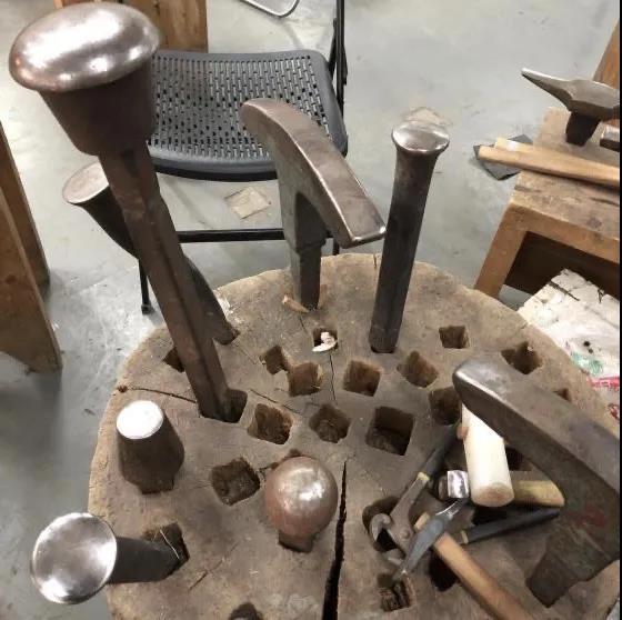 一開始我對這些天天瞧見使用的工具沒曾上過心,還是在課余和學姐聊天的過程中才知道這些工具的寶貴,尤其是那一套鍛造專用的鐵砧,不僅制作費時,價格也是讓人咂舌,以至于我在后面做東西的過程中都小心翼翼的對待這些朝夕相處的“大寶貝們”。更不用說專業(yè)的焊接、打磨、鋸切設備,可以說是一應俱全。這使得金工專業(yè)的學生很少因為硬件設施的問題發(fā)愁,也使得我們在課余有很多的機會去試試我們感興趣的技法和創(chuàng)作方式。
