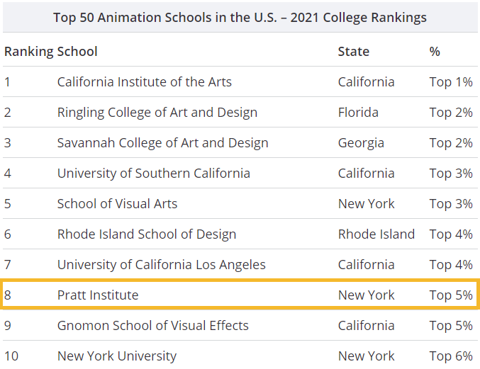 在美國藝術學校動畫專業排名中,Pratt學院被評為全美最頂尖的動畫設計專業學院之一。在Animation Career Review發布的2021年最新動畫專業院校綜合排名中,普瑞特藝術學院在全美約200所動畫院校中排名第8,名列所有參選院校前5%,與去年相比,排名顯著上升。