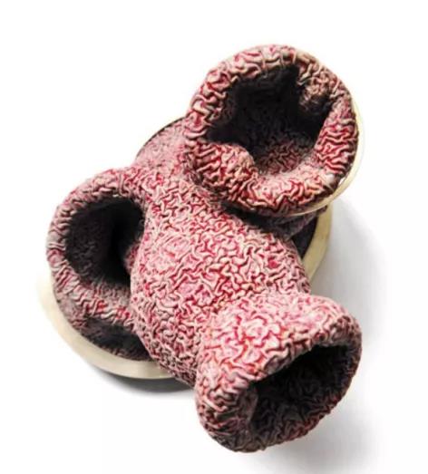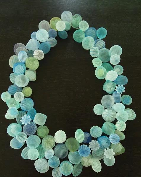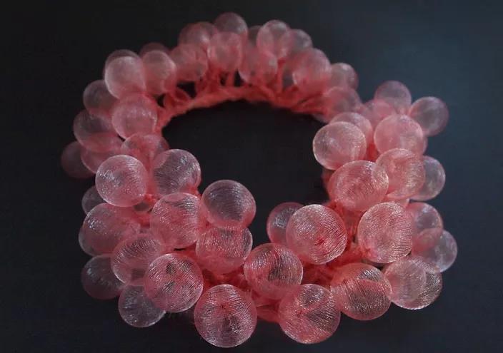 現今,她用透明的合成面料將她的想象力帶到生活中,創造了可穿戴的藝術,模糊了時尚和雕塑之間的界限。她把織物折疊成迷人的形式,靈感來自海洋:珊瑚形狀的項鏈、胸針和戒指,像泡泡一樣光滑、失重,甚至連小美人魚都會羨慕的碎片。