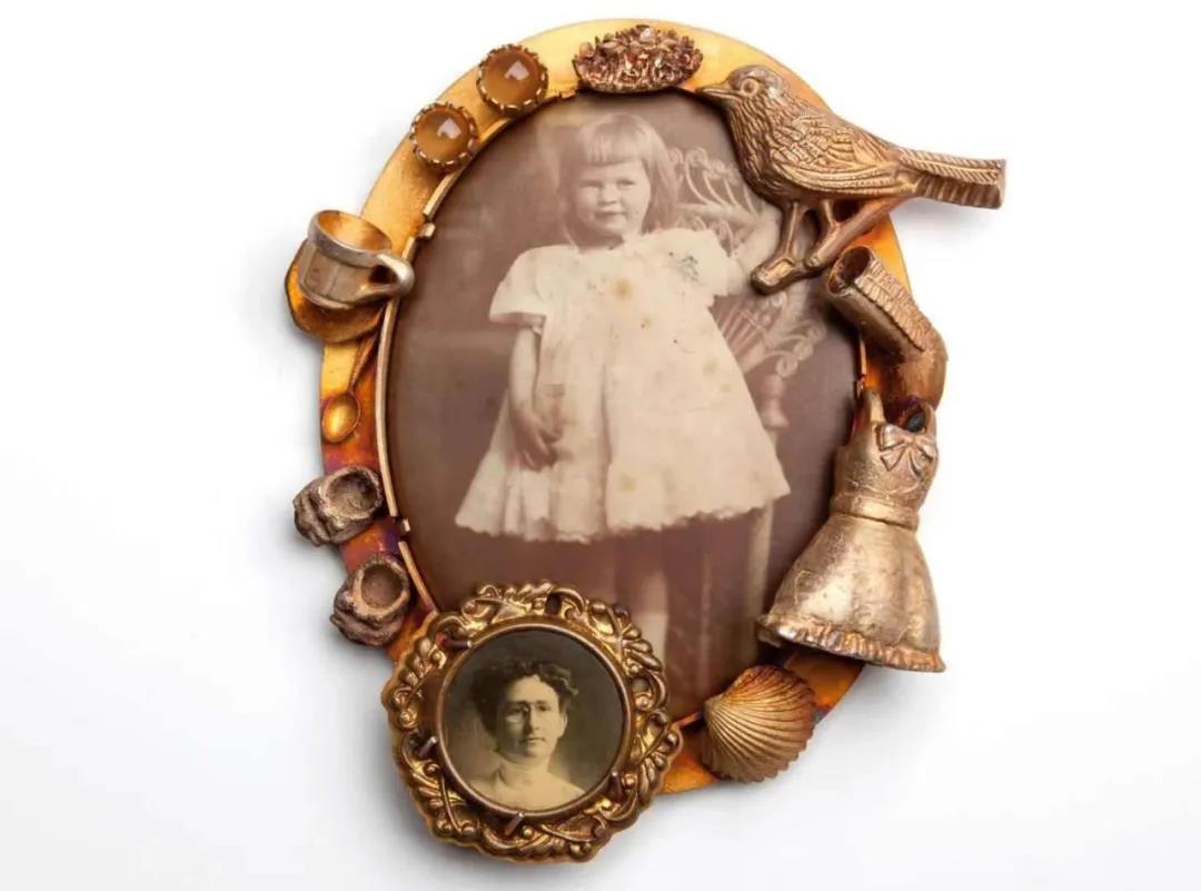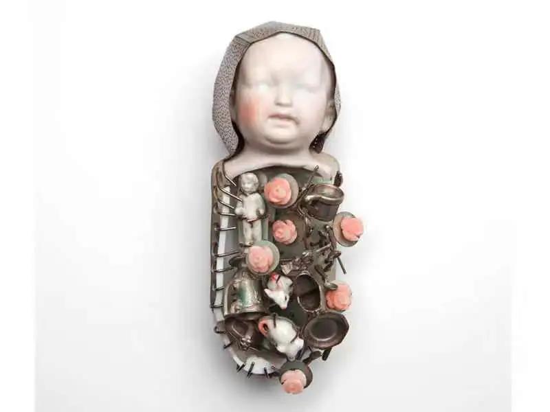 “改造的錫罐頭,鋼,鐵,銀,寶石、家用烘焙工具,餅干罐和藥罐,常常成為戰(zhàn)爭時期女性居家角色的視覺意象。舊錢包取下的皮革與古舊的骨質(zhì)代幣則隱喻了錢幣。這些對收藏家以外的一般人不再具有意義的物件,經(jīng)過重置提供了新的敘事:告訴人們過去的女人的故事。