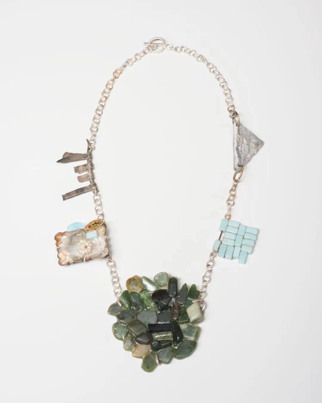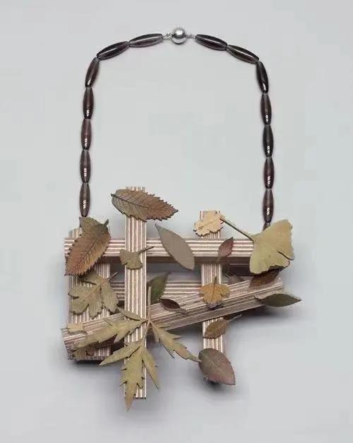 金屬是最常見的傳統(tǒng)首飾制作材料,然而,當代首飾中,越來越多的藝術(shù)家通過非傳統(tǒng)的材料去創(chuàng)作首飾;比如回收的硬幣、瓶蓋、老化的金屬配件、老舊毛巾、手提電話和洋娃娃部件。這些東西舍棄原本的功能,與柔和的色彩結(jié)合變成一件件項鏈、吊墜盒手鐲。這是一個緊張的回收過程。物品本來要被扔掉或者遺棄,藝術(shù)家們經(jīng)過特殊的選擇讓它們以不同的方式回到生活中。