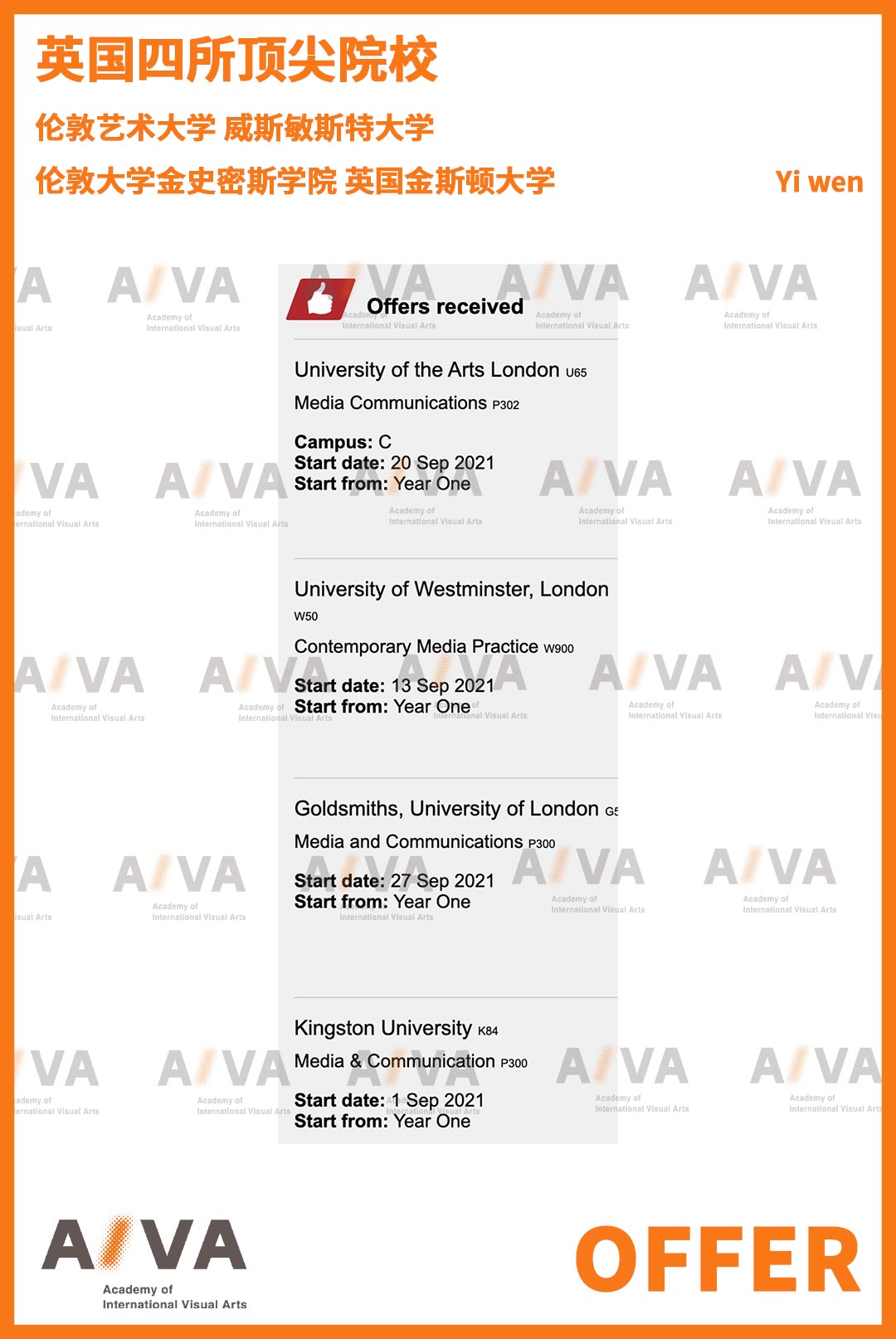 在今年的申請季中,AIVA的Yvonne同學憑借高質量的作品集及優異的學術成績,成功斬獲紐約大學Tisch藝術學院的本科錄取,同時還收獲了包括UAL、威敏、金匠、金斯頓、艾默生學院等多所頂尖英美院校大滿貫!(此處掌聲安排)