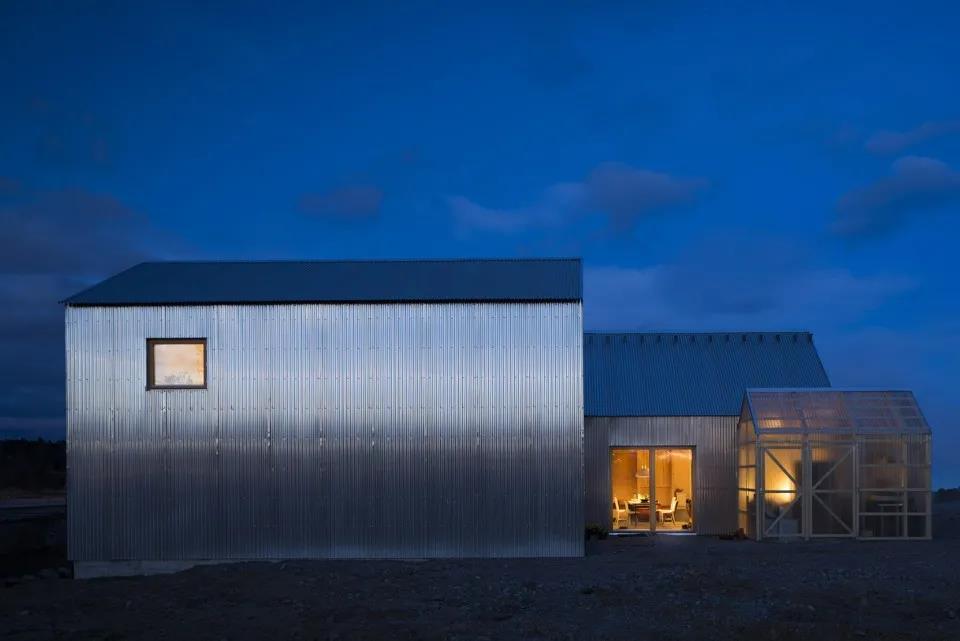"House for mother" 整棟房屋分為兩個長方形區(qū)塊,以不對稱造型構(gòu)造出350平米的狹長空間。房屋外墻包覆著一層波紋鋁板,使得房子隨著日光照射的變化,呈現(xiàn)出有趣的光影效果。