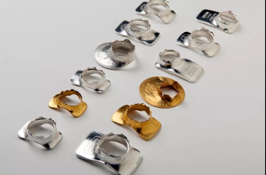 同樣是使用黃金,Johanna Dahm在2011年,開(kāi)始了一個(gè)新的系列:<Wilhelm Tell’s Shot”>。在國(guó)際銀行危機(jī)的刺激下,她探索了瑞士民間英雄威廉泰爾以個(gè)人之力對(duì)抗政府壓迫,導(dǎo)致了他被迫射擊兒子頭上蘋果的標(biāo)志性故事。在這個(gè)新的(無(wú)限的)系列中,達(dá)姆攻擊了今天的物質(zhì)價(jià)值符號(hào)——金條和銀條,并用相當(dāng)現(xiàn)代的一把機(jī)關(guān)槍射擊。由此產(chǎn)生了令人驚訝的戒指,暴力的轉(zhuǎn)變方法否定了它作為一種珍貴的材料的商品價(jià)值,取而代之的是它的藝術(shù)價(jià)值的完整性。