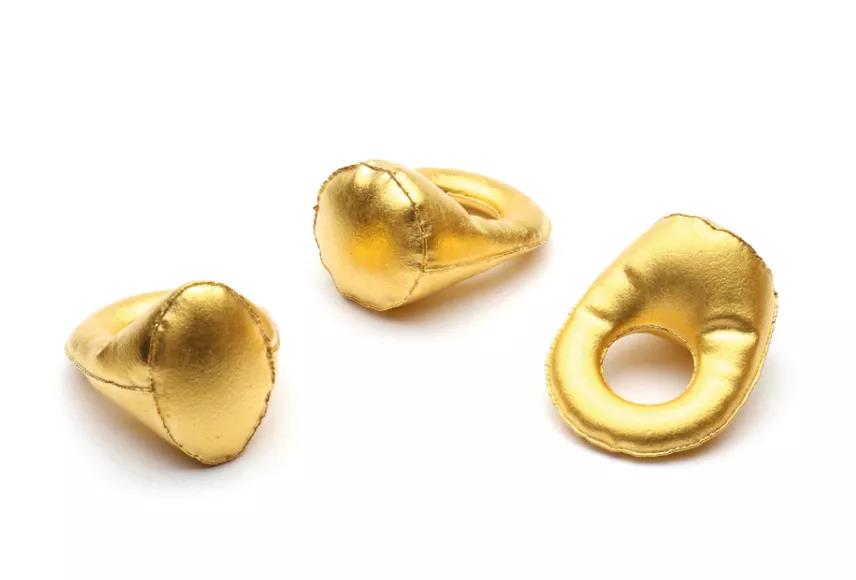 丹麥?zhǔn)罪椝囆g(shù)家Kim Buck對(duì)于黃金的運(yùn)用則變成了其象征性的首飾語(yǔ)言。他早期的<Inflated>和<Puffed Up>系列中,他向我們展示了他高超的技術(shù)——將黃金制成極薄的片然后縫制在一起,就好像冷硬的金屬真的像氣球一樣被吹了起來(lái)。