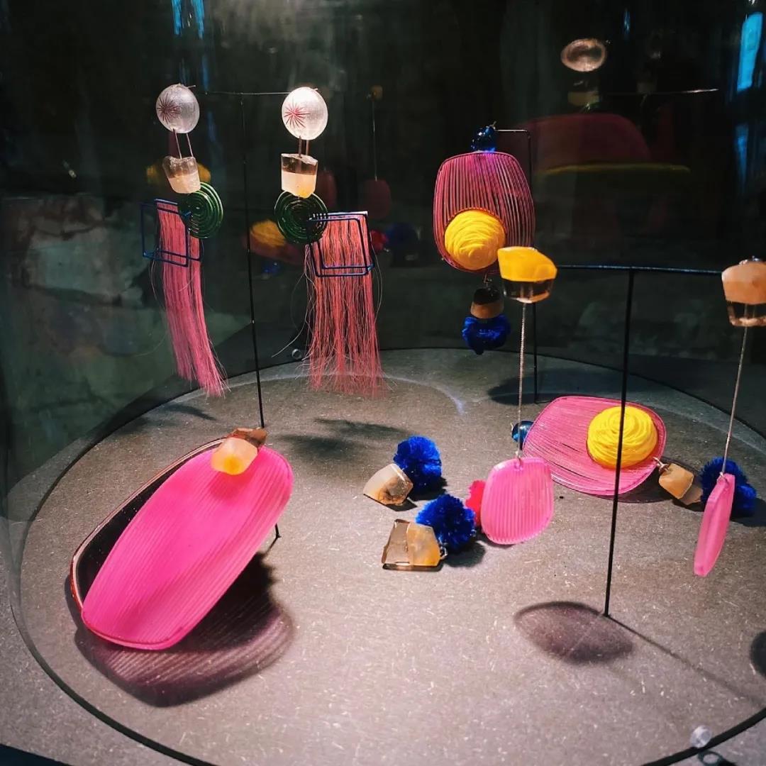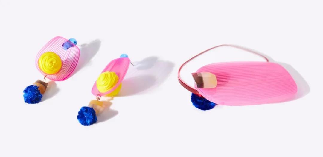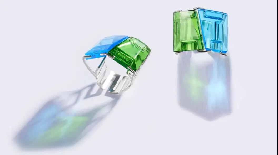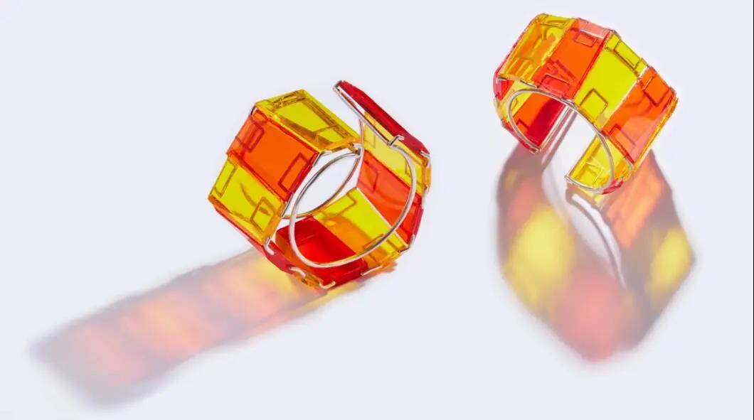 從活力耀眼的紅與黃,到平靜放松的藍(lán)與綠,每一件首飾都在觀者眼前構(gòu)成了一幅生動(dòng)的想象圖景:日出,海灘,春天,草坪…… 當(dāng)藍(lán)與黃交織時(shí),若隱若現(xiàn)的綠色在耳邊浮現(xiàn),不禁讓人聯(lián)想起夏日清涼的雞尾酒。伴隨著光影變幻和色彩嬉戲,首飾所創(chuàng)造的互動(dòng)空間微妙地影響著人們的情感體驗(yàn)。
