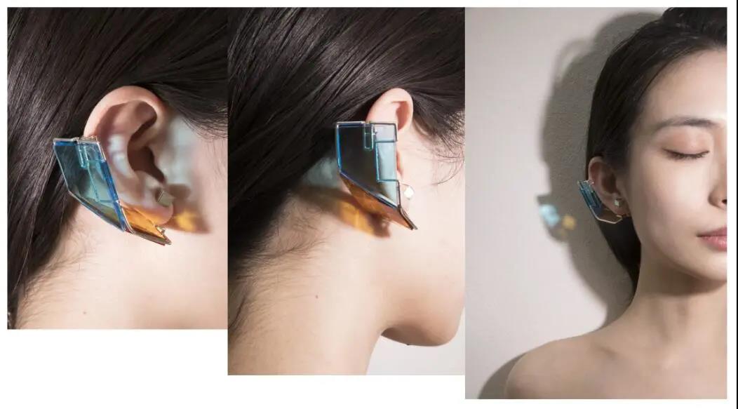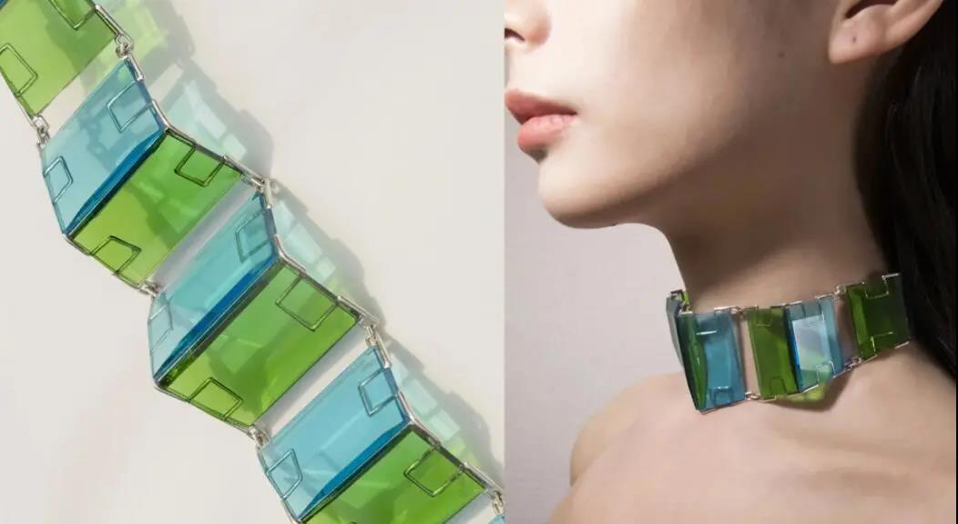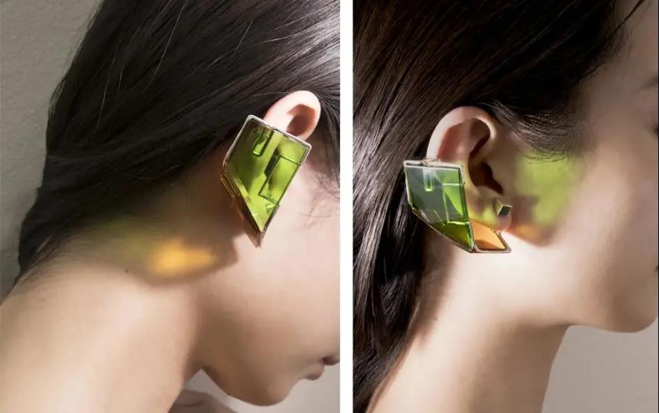 為了最大限度地讓光線透過(guò)玻璃,Xinyi 將幾何形狀的玻璃片巧妙地固定在了金屬框架上,兩片相鄰的彩色玻璃像折疊紙一樣形成了拱形的角度,在玻璃和佩戴者的皮膚上勾勒出交疊的色彩與光影,給予了細(xì)膩而豐富的視覺(jué)力量和情感提升。