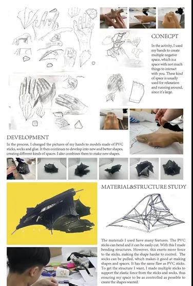 ▲ 正在讀初中的Yang,對建筑設計有很大的熱情,僅僅用了6次課就完成了一個Mini Project。他從雙手的動作中衍生出結(jié)構(gòu),發(fā)展成了一個異形展館,還排版整理了設計過程,真是未來不可限量!