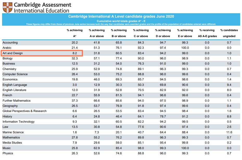 A-Level課程共有70多門科目,科目間高分率也有一定的差異,相對于A*率高達20%的生物、數學等科目,藝術和設計科目拿到A*的概率則低很多,2020年CAIE統計只有8.2%。