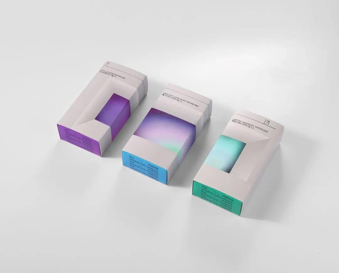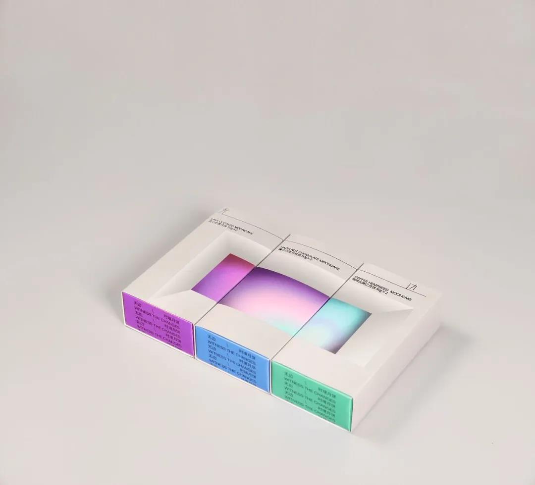 “無邊/時境”月餅禮盒用藍、紫、綠三種顏色進行過渡融合,營造出立體透視的縱深效果,模擬出不同狀態下的云端變化,具有強烈的設計感與時尚感。