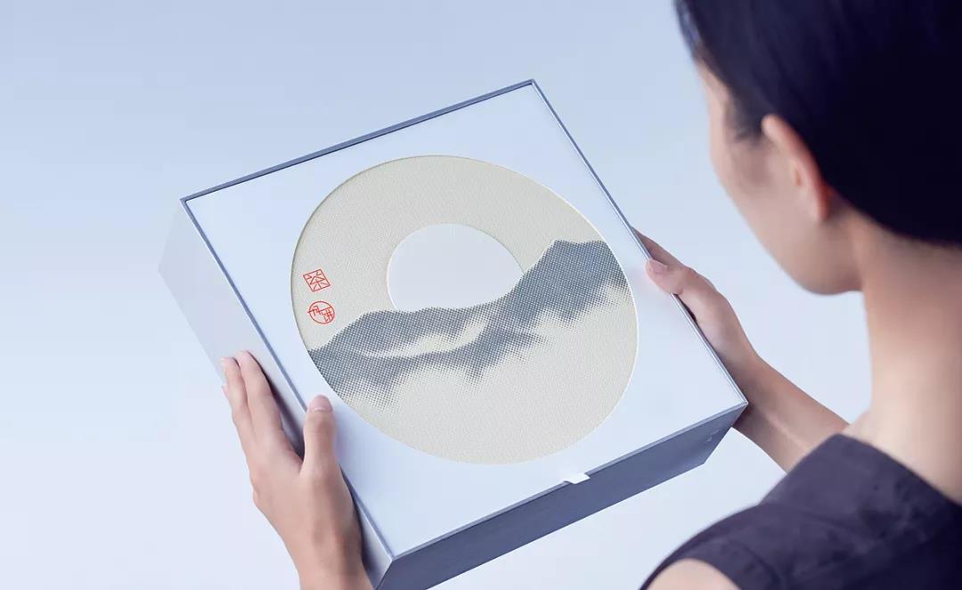 茶品牌“山田土”將天上的月亮摘下,放在了2021年的月餅禮盒中。用手輕碰,“月亮”就會亮起,還能看到一只“奔跑”的玉兔。禮盒的包裝設計從山水月夜的景致中汲取靈感,以現代波點結合漸變手法,呈現中國水墨畫式的當代意境。