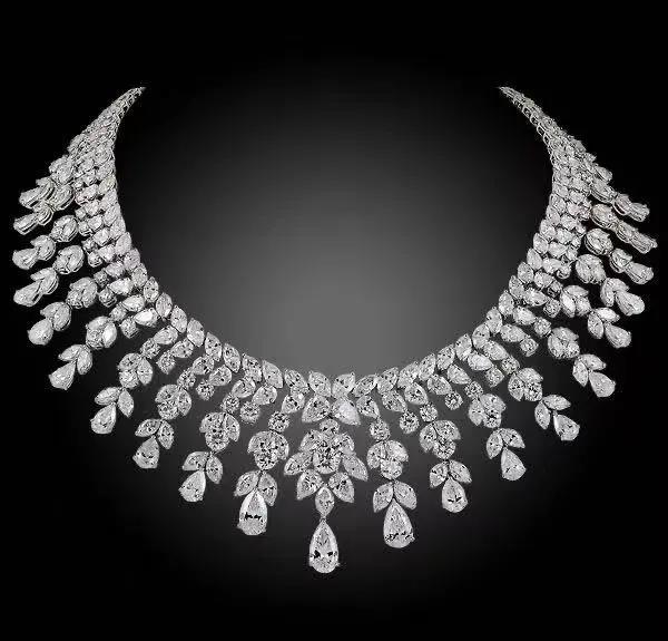 Yafa認證古董珠寶:白金鉆石項鏈 - 總重150.97克拉的鉆石鑲嵌于鉑金底座上。An exquisite diamond necklace,designed as aseries of graduated trefoil pear-shaped diamond links of a foliate motif, alternating with luminous brilliant-cut diamonds, the front set with a fringe of pear-shaped diamonds, finely mounted in platinum.The diamond weighing approximately 150.97 cts.with 7 GIA certificates and appraisal from Yafa Signed Jewels.