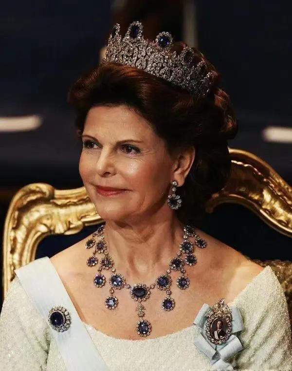 Nobel Prize Tiaras: Queen Silvia of Sweden wears the Leuchtenberg Sapphires,December 2004. 瑞典王后西爾威亞佩戴藍寶石皇冠頭飾The Leuchtenberg Sapphire Tiara出席2004年12月的諾貝爾頒獎典禮。